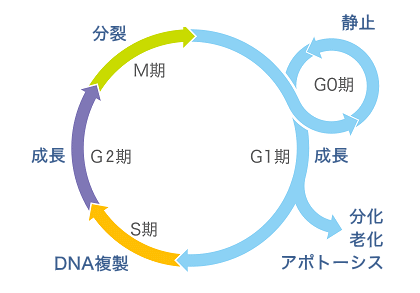このように、細胞は常に分裂増殖しているわけではなく、実は体内細胞のほとんどはG0期にとどまっており、分裂や増殖を停止しています。