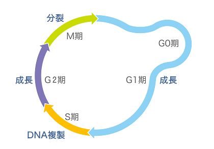 正常細胞とは異なり、分裂を終えたがん細胞は、静止期であるG0期にはとどまることなくG1期に入り、アポトーシスすることなく無制限に増殖をつづけます。
